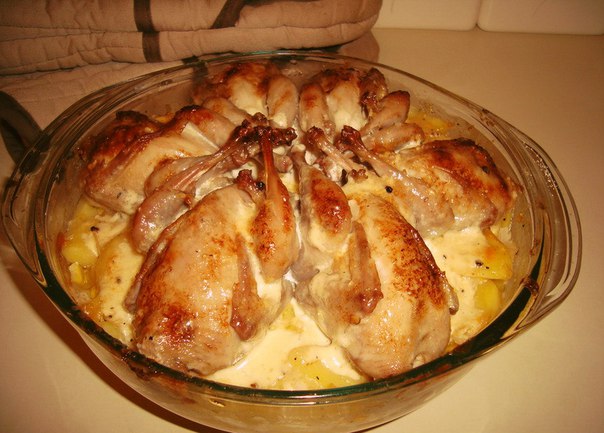 Режем каждую птичку на четыре части. (Надеюсь, выпотрошить и опалить ее вы не забыли.) Добавляем в муку соль и перец. Обваливаем кусочки дичины и жарим их в сливочном масле на медленном огне не дольше десяти минут, пока мясо не приобретет бежевый цвет. Выкладываем кусочки мяса на овощи в утятницу, добавляем туда по одной охотничьей колбаске на порцию, стакан мясного или птичьего бульона, четыре столовых ложки портвейна, пару лавровых листочков.